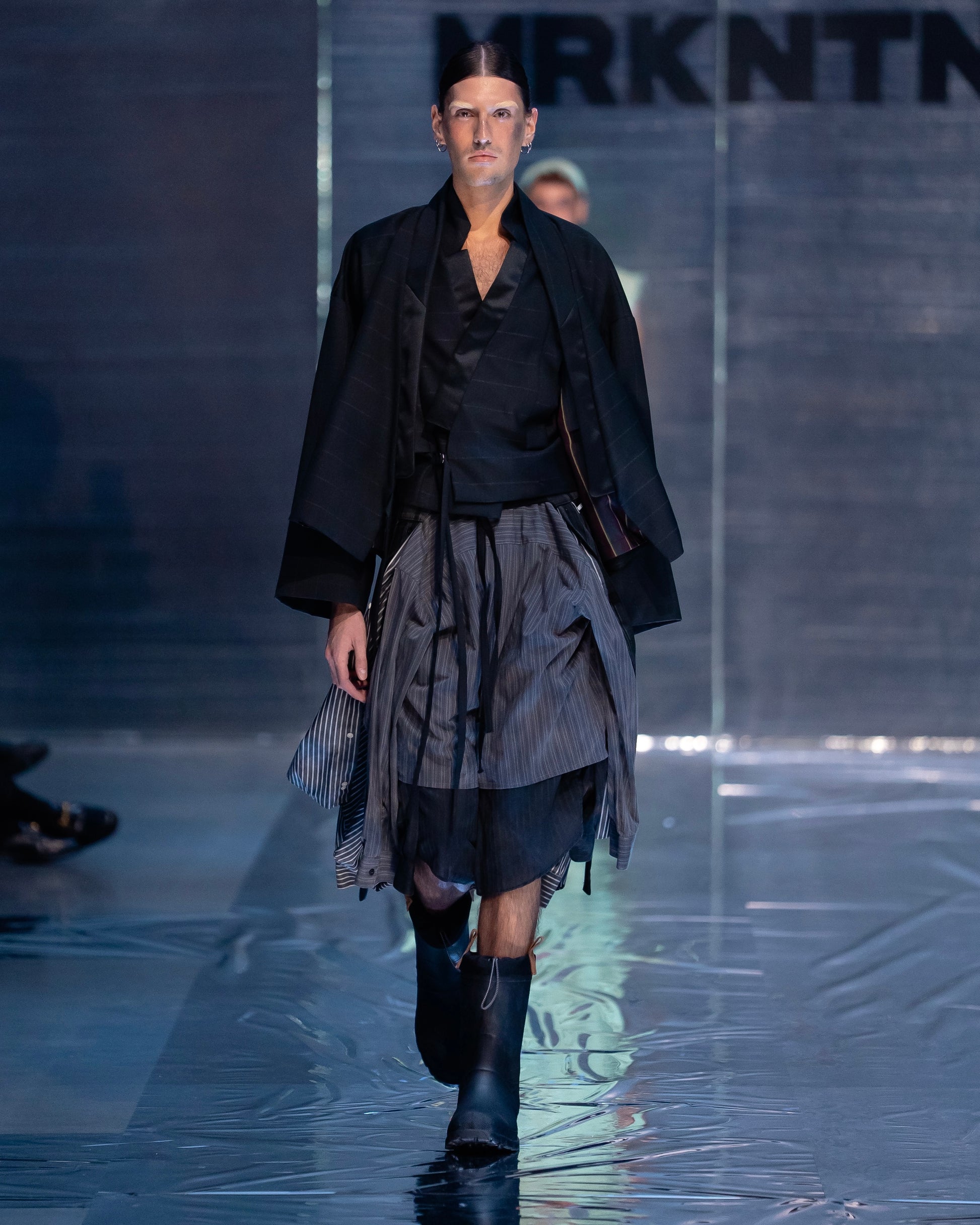 Double-panel kilt made from upcycled shirts, designed in two parts. Please note that each garment is unique and the shirts used for upcycling may vary in pattern.