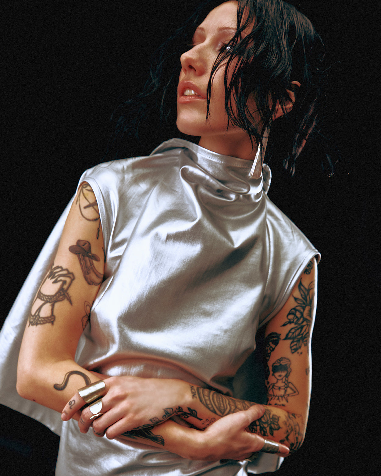 Robe rectangulaire drapée sans manches, dos ouvert, en denim enduit argent, dotée de deux bandes ajustables au dos.